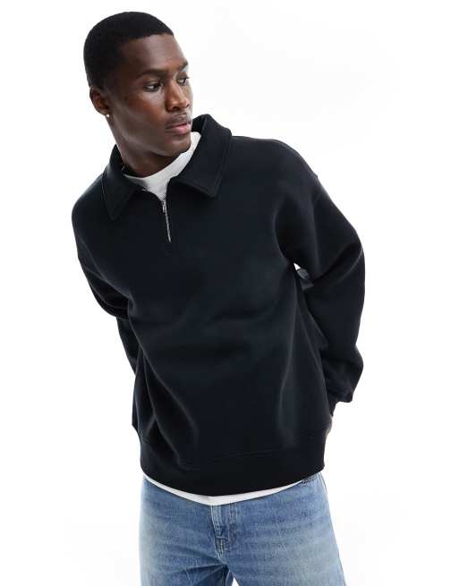 Selecte Homme - Oversized polo met korte rits en lange mouwen in zwart