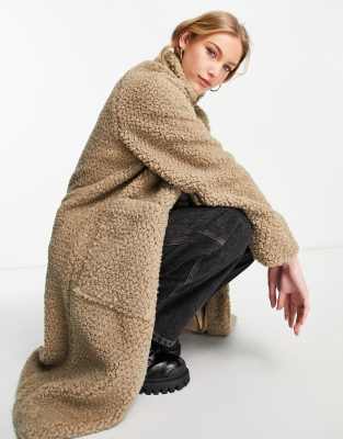 Selected Femme - Teddy jas met oversized zakken, opstaande boord en lange pasvorm in beige