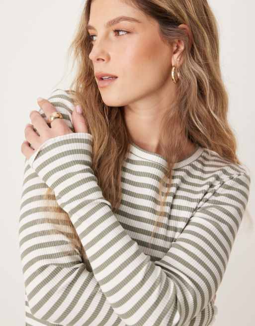 Selected - Geribbeld T-shirt met lange mouwen en groen-witte strepen