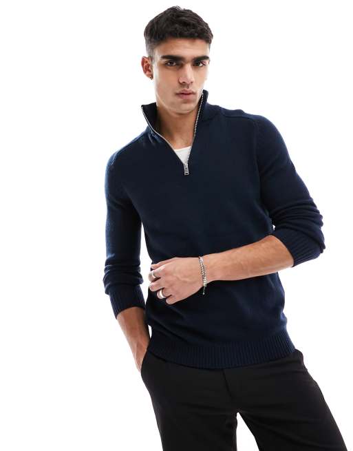 Selected Homme - Hooggesloten trui van wolmix met 3/4 rits in marineblauw