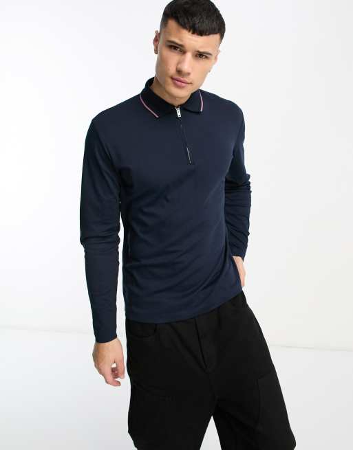 Selected Homme - Polo van katoenmix met lange mouwen en rits in marineblauw