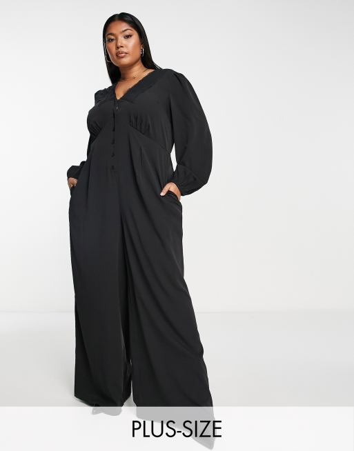 Simply Be - Jumpsuit met wijde pijpen, knoopsluiting en kanten detail in zwart