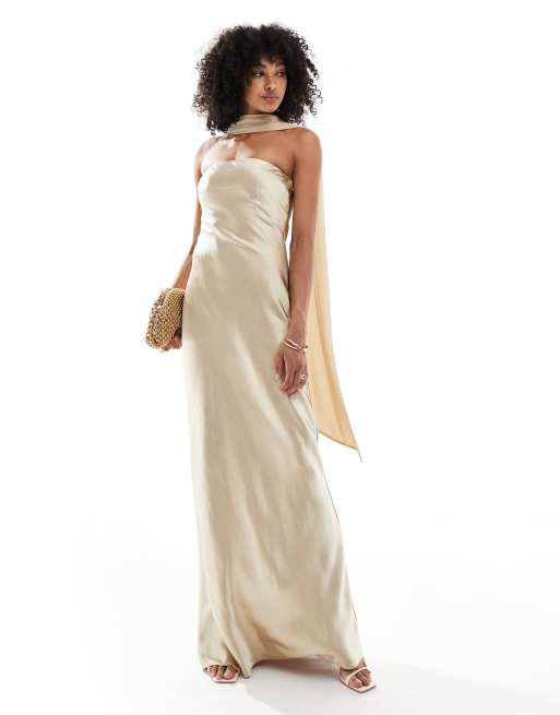 Six Stories - Bruidsmeisjes - Satijnen maxi jurk met sjaal van chiffon in zachtgoud