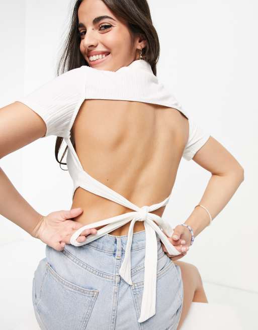 Skylar Rose - Geribbelde crop top met open achterkant en knoopsluiting
