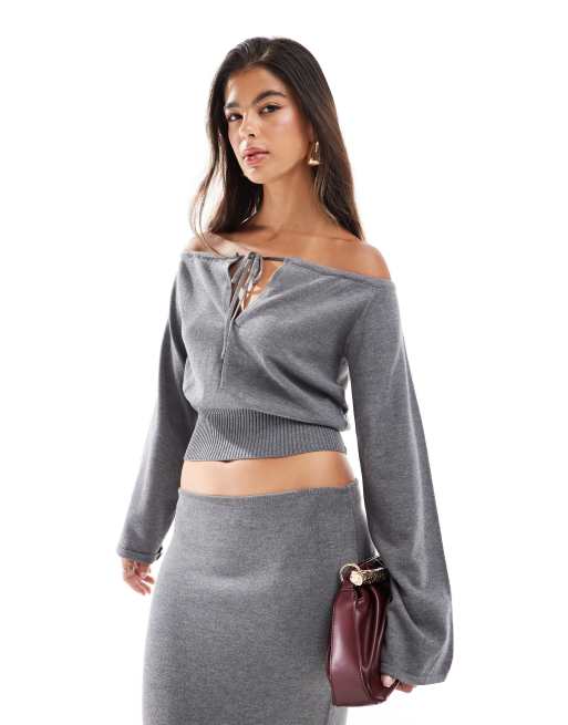 SNDYS - Gebreide top met blote schouders en strikdetail in grijs, deel van co-ord set