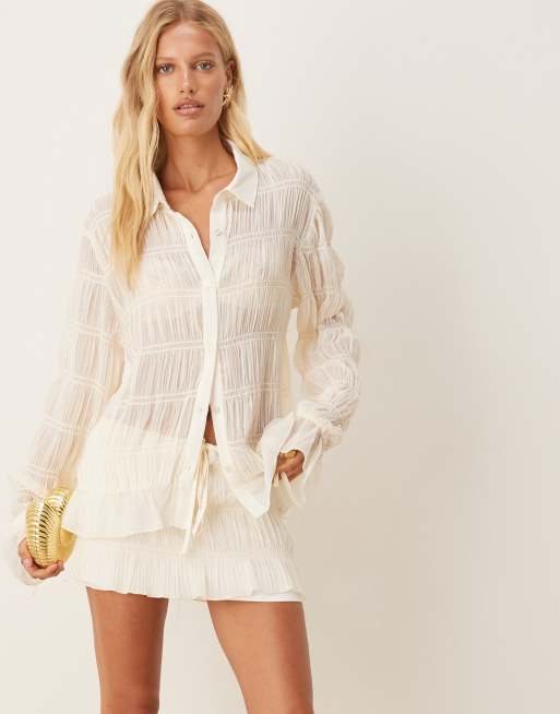 SNDYS - Gesmokt doorschijnend overhemd met uitlopende mouwen in crème, deel van co-ord set