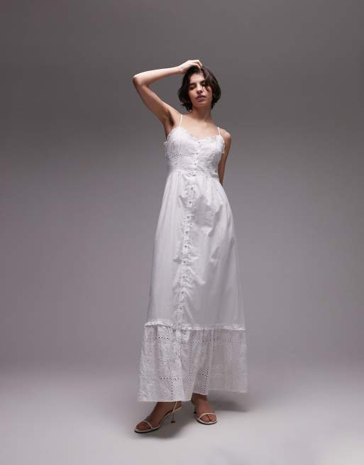 SNDYS - Maxi cami-jurk met broderie, ruches en knoopsluiting in wit