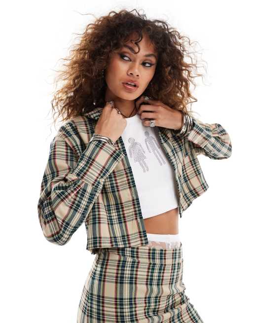 Something New - Cropped geruit oversized overhemd in marineblauw en beige, deel van co-ord set