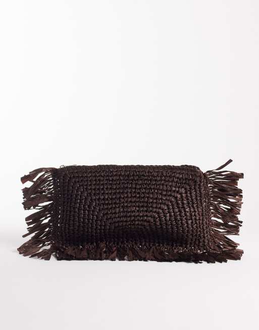 South Beach - Clutch van stro met franjes in chocoladebruin