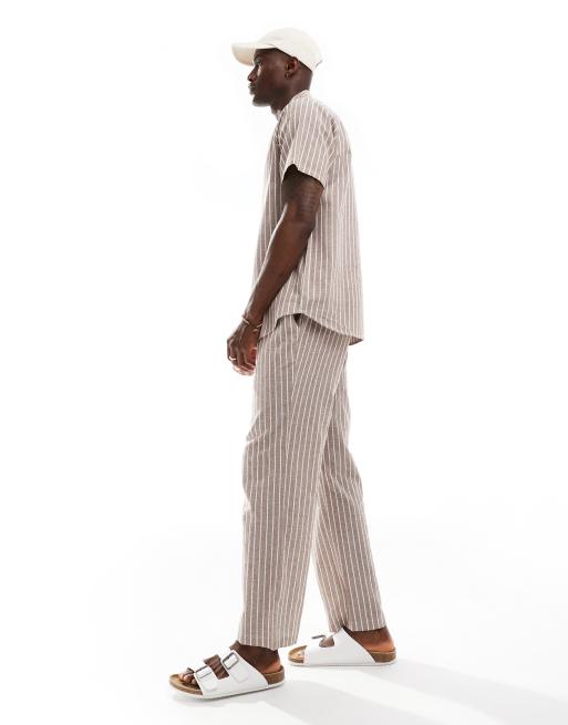 South Beach - Gestreepte linnen strand co-ord set in bruin en wit