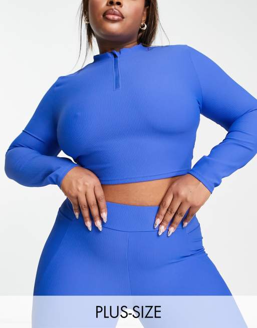 South Beach Plus - Geribbelde top met 1/4 rits en lange mouwen in kobaltblauw