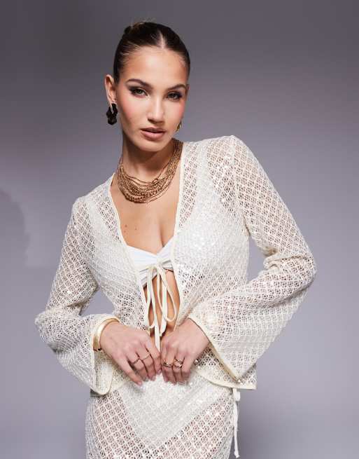 South Beach - Strandoverhemd met lange mouwen, gestrikte voorkant en lovertjes in crème, deel van co-ord set