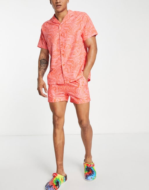 South Beach - Zwemshort en overhemd in rood en roze met wervelprint