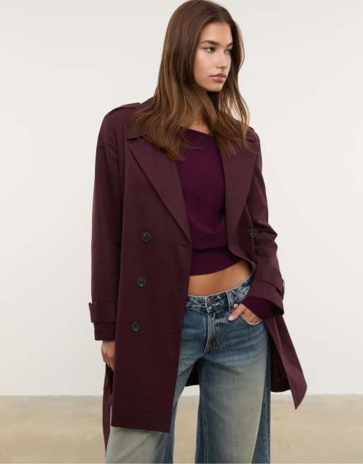 Stradivarius - Basic regular-fit trenchcoat met riem in bordeauxrood