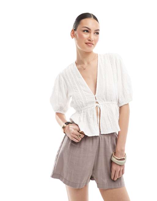 Stradivarius - Boho-blouse met pofmouwen in wit