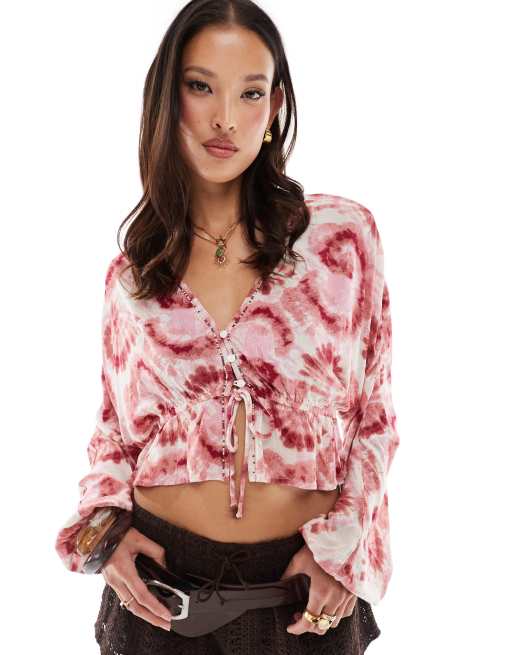 Stradivarius - Cropped overhemd met strik in tie-dye roze