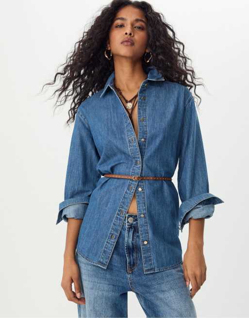 Stradivarius - Denim overhemd met riem in medium lichtblauw denim