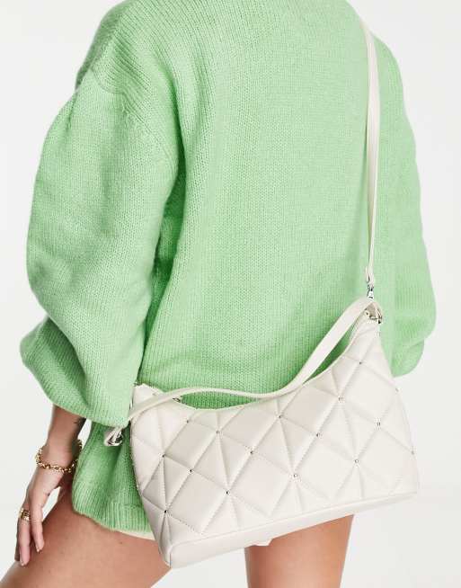 Stradivarius - Doorgestikte schoudertas met lang hengsel in ecru