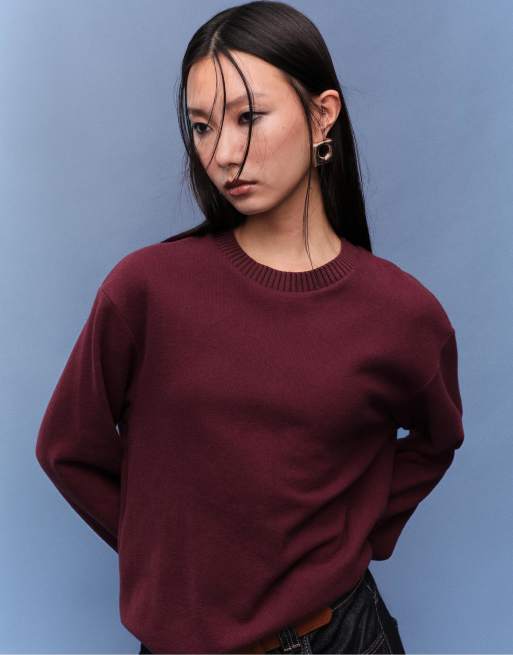 Stradivarius - Gebreid T-shirt met ronde hals in aubergine
