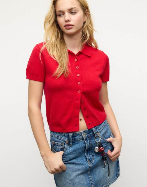 Stradivarius - Gebreide polotrui met korte mouwen in rood