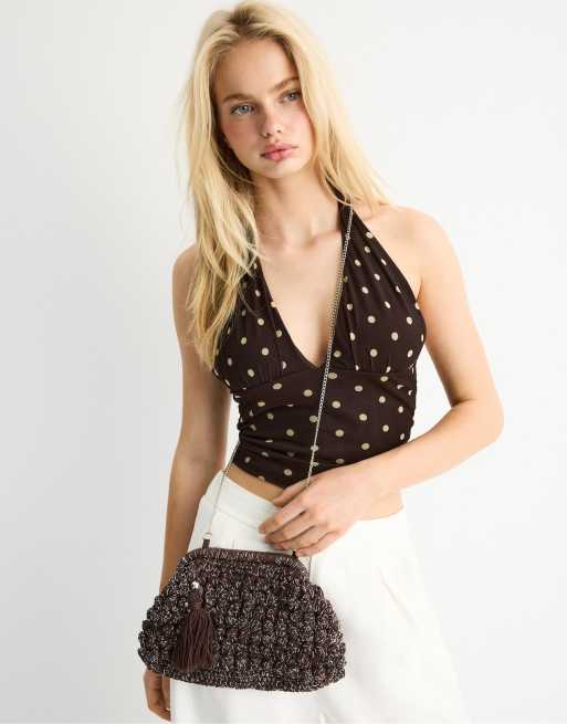 Stradivarius - Gehaakte bucket tas met metallic draad in bruin