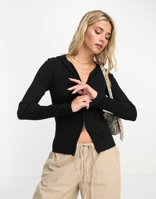 Stradivarius - Geribbelde top met dubbele rits in zwarte wassing