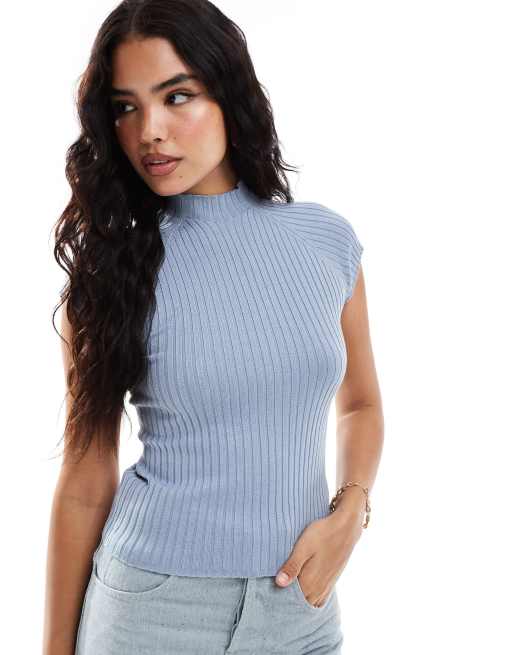 Stradivarius - Geribbelde top met korte mouwen in lichtblauw