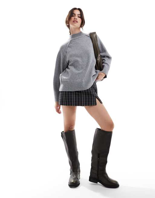 Stradivarius - Geruit rokje met split in de zoom in grijs