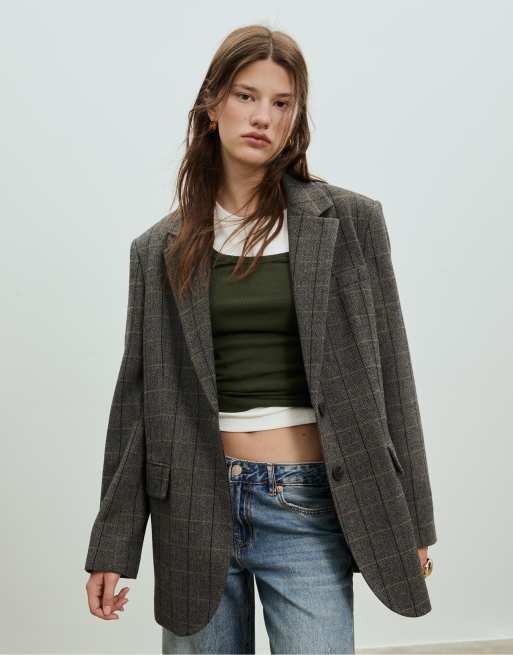 Stradivarius - Geruite oversized blazer in donkergrijs