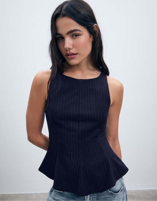 Stradivarius - Gestreepte peplumtop zonder mouwen in marineblauw