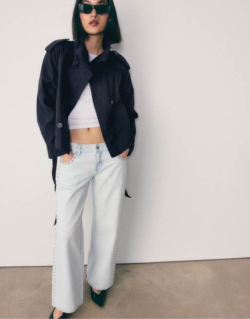 Stradivarius - Hoogsluitende trenchcoat met riem in donkerblauw