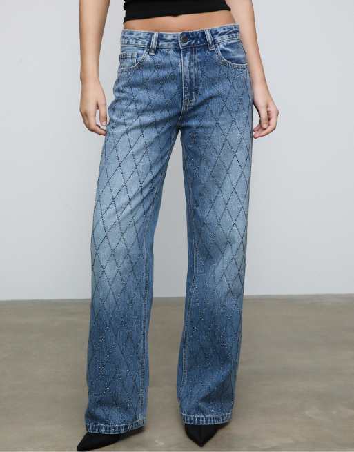 Stradivarius - Jeans met strass-steentjes in medium blauw denim