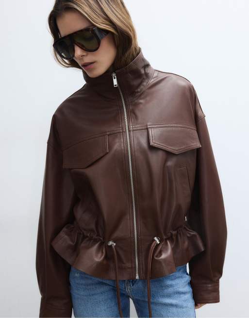 Stradivarius - Leren jack met verstelbare zakken in bruin