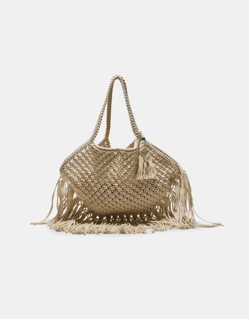 Stradivarius - Macramé schoudertas met franjes in ecru
