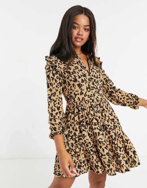 Stradivarius - Overhemdjurk met ruches aan de schouders in beige dierenprint