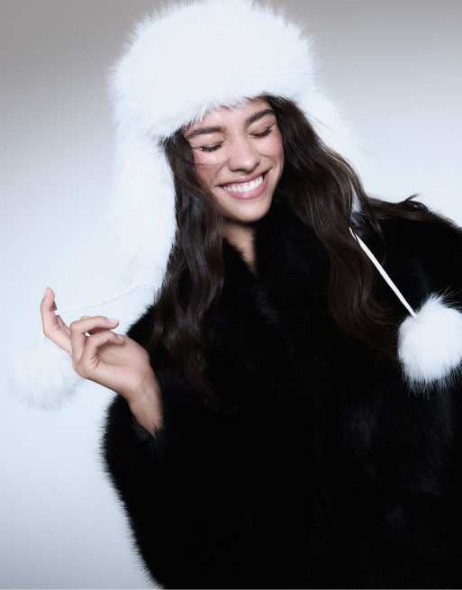 Stradivarius - Pilotenmuts van imitatiebont met pompons in ecru