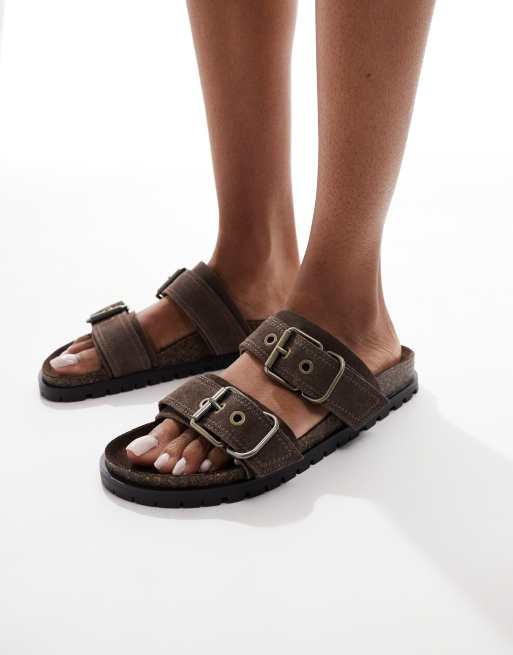 Stradivarius - Platte sandalen van leer met dubbele banden in donkerbruin