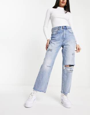 Stradivarius - Rechte cropped jeans met scheuren in middenblauw
