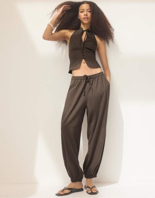 Stradivarius - Sarouel broek met linnenlook in bruin