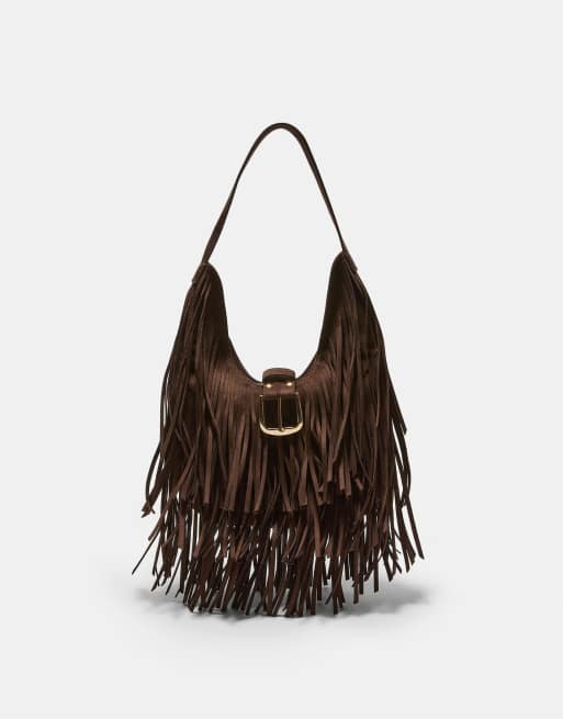 Stradivarius - Schoudertas met franje en gesp in bruin