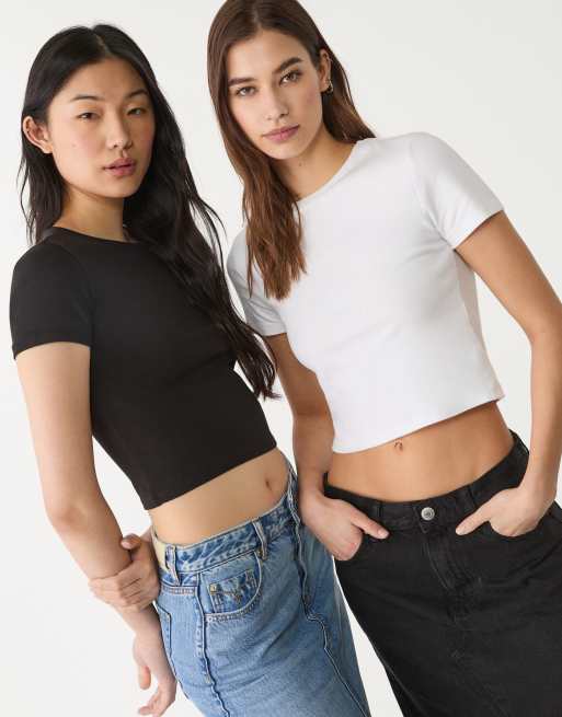 Stradivarius - Set van 2 cropped katoenen T-shirts in zwart en wit