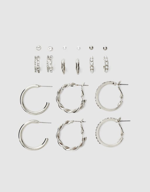 Stradivarius - Set van 9 paar oorbellen en oorringen met siersteentjes en parelkralen in grijs