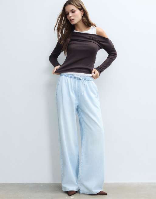 Stradivarius - Soepelvallende denim broek met trekkoord in medium lichtblauw