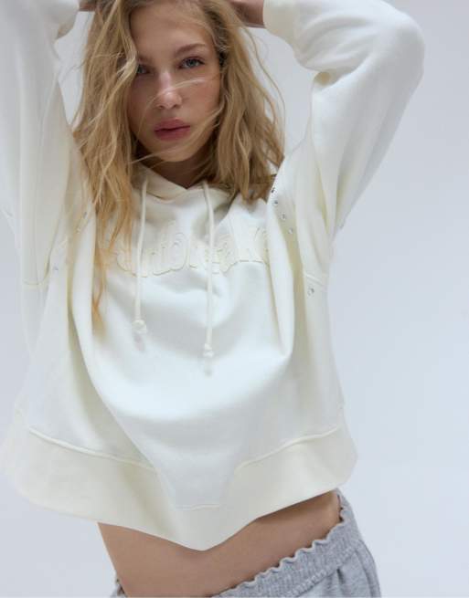 Stradivarius - Sweatshirt met studs, borduursel en capuchon in ecru