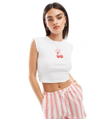 Stradivarius - T-shirt met open achterkant en kersenprint in wit