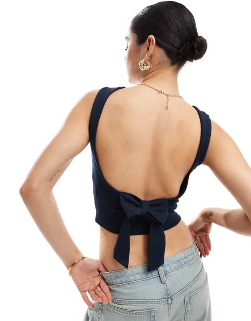 Stradivarius - Top met open, gestrikte achterkant in marineblauw
