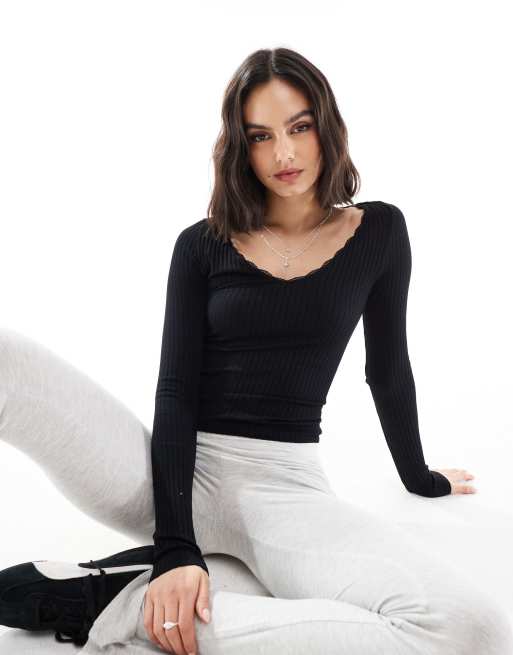 Stradivarius - Top van jersey met V-hals en lange mouwen in zwart