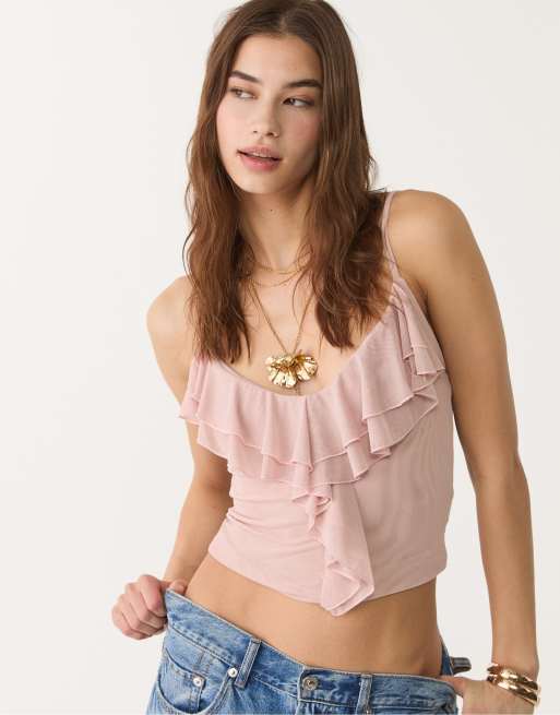 Stradivarius - Top van tule met ruches in pastelroze