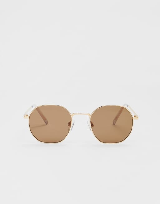 Stradivarius - Zeshoekige metalen zonnebril in bruin