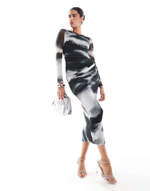 Style Cheat - Midi jurk van mesh met lange mouwen in zwart-witte marmerprint